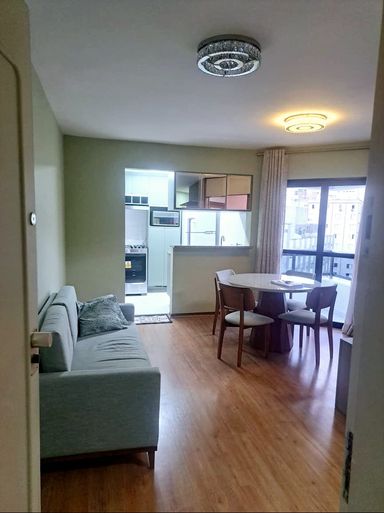 Apartamento de 44m² e totalmente mobiliado com 1 dormitório, banheiro, cozinha integrada com a sacada fechada e 1 vaga de garagem. Possui marcenaria completa nova, ar condicionados novos e já instalados, eletrodomésticos, geladeira, cooktop, sofá, cama, tapete, utensílios e muito mais. Empreendimento novo e completo, localizado em frente ao Parque do Ibirapuera e com área de lazer completa: academia, piscina adulto e infantil, sauna, bicicletário, espaço coworking, salão de festas, garagem com vagas para carro elétrico, segurança 24 horas, etc.