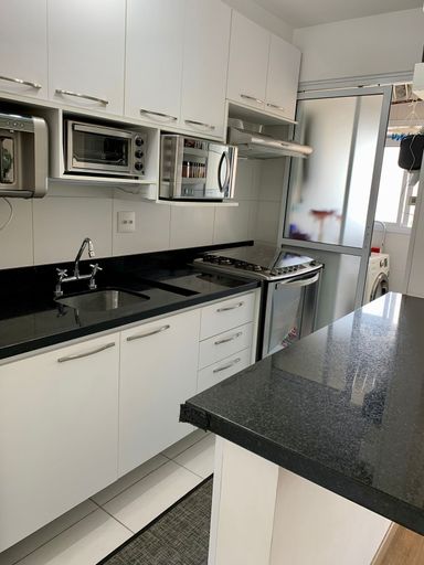 A cozinha é um ponto alto, apresentando bancadas em mármore São Gabriel, fogão embutido e marcenaria de alta qualidade. A área social se estende para uma varanda espaçosa com uma bela vista livre, ideal para momentos de relaxamento. Para maior conveniência, o apartamento dispõe de uma vaga de garagem e um depósito individual, garantindo organização extra para o morador.