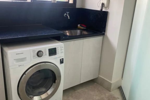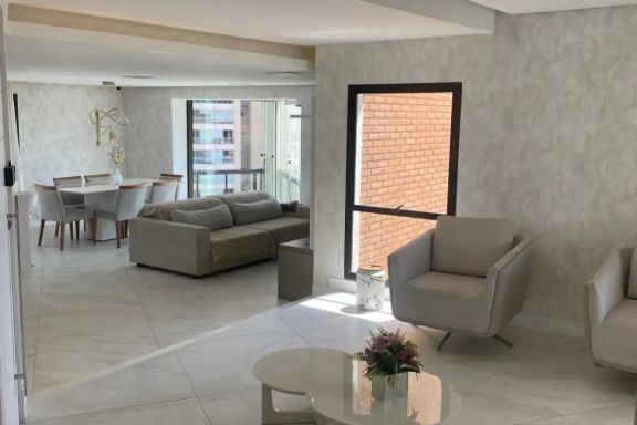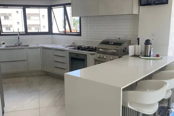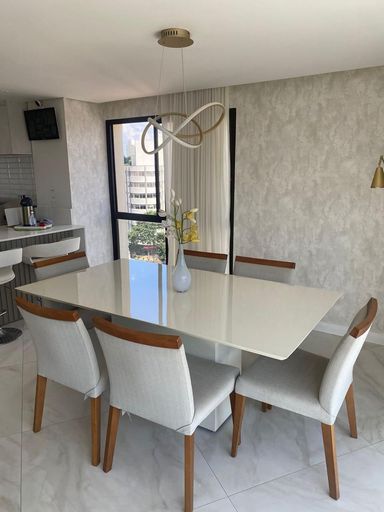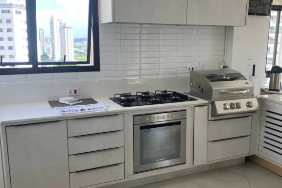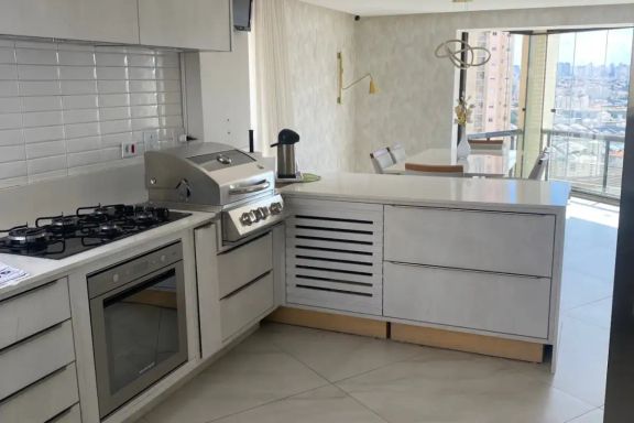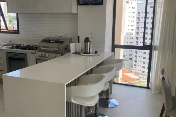 A área social é um verdadeiro convite ao convívio. A sala é espaçosa, projetada para dois ambientes distintos, e se conecta a uma varanda estendida, totalmente envidraçada, que pode ser utilizada como um agradável espaço de relaxamento ou home office. A moderna cozinha, em conceito aberto, integra-se perfeitamente à sala e conta com armários planejados de ponta, ideal para quem adora cozinhar e interagir com as visitas. A planta ainda inclui um quarto e banheiro de empregada, oferecendo flexibilidade como despensa ou área de serviço auxiliar.