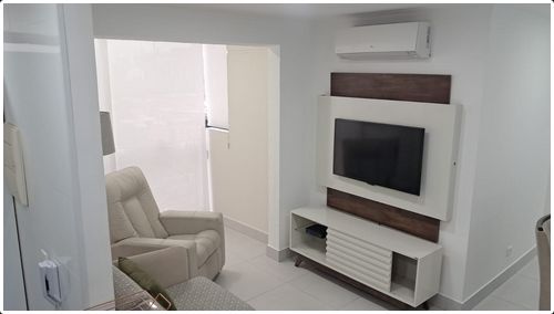 Com 50 m² bem distribuídos, o apartamento apresenta ambientes pensados para o dia a dia com conforto e funcionalidade. O primeiro dormitório é amplo e aconchegante, equipado com bicama de solteiro, abajur e marcenaria planejada. O segundo dormitório também conta com cama de solteiro e marcenaria moderna. O banheiro social é completo e possui acabamentos de bom gosto, além de um lavabo prático e funcional. A área social integrada ao terraço envidraçado é clara e acolhedora, equipada com sofá, rack, televisão e poltrona reclinável, criando um espaço ideal para relaxar ou receber visitas.