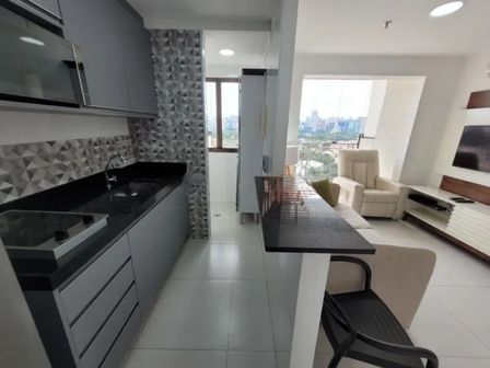 A cozinha é planejada e totalmente equipada, com marcenaria personalizada, geladeira em inox, cooktop e utensílios, oferecendo praticidade no dia a dia. O imóvel conta ainda com área de serviço e uma vaga de garagem determinada no segundo subsolo. Entre os diferenciais, destacam-se a pintura nova, iluminação moderna, ar-condicionado nos dormitórios e no living, cortinas rolo em todos os ambientes, marcenaria sob medida, novo padrão elétrico e persianas no living.