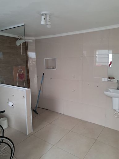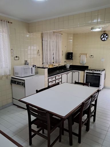 A parte principal da casa conta com três dormitórios, sendo um deles uma suíte, e todos já vêm equipados com armários embutidos. Há um total de cinco banheiros na propriedade, além de três salas que garantem ambientes flexíveis para receber e conviver. A cozinha é ampla, possui copa integrada e está equipada com móveis planejados. Para maior comodidade, há uma área de serviço completa e uma dependência completa de empregados, incluindo dormitório e banheiro.